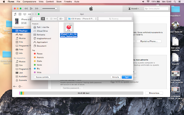 Terminato il download, ricolleghiamo l’iDevice al PC, apriamo iTunes e con il tasto SHIFT (da MAC tasto alt) premuto clicchiamo su Ripristina iPhone, si aprirà una finestra e da lì dovremmo selezionare il file scaricato in precedenza, a questo punto partirà l’installazione, dovremmo pazientare qualche minuto. Al riavvio dell’iDevice ci ritroveremo con iOS 9.