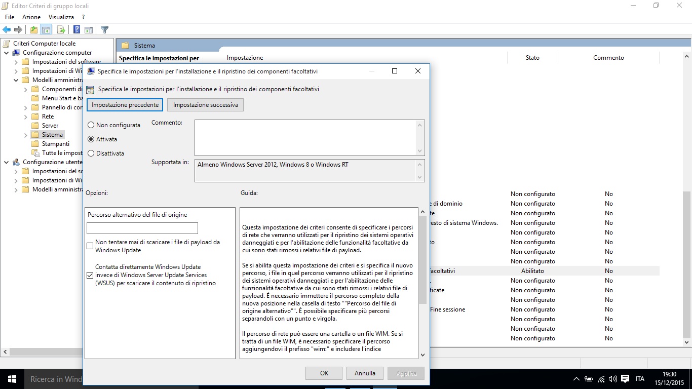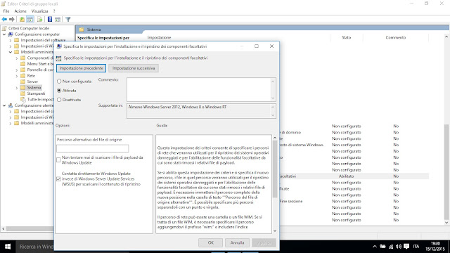 - Andiamo in Configurazione Computer -> Modelli Amministrativi -> Sistema, ora cerchiamo la voce “Specifica le impostazioni per l’installazione e il ripristino di componenti facoltativi” e diamo doppio click.