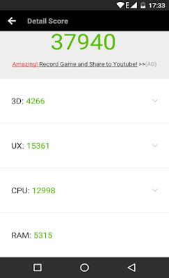 Il punteggio complessivo del benchmark è di 37.940 punti basati su rendering 3D, la UX – User eXperience (tiene conto di multitasking e runtime), performance della CPU e RAM il che lo colloca poco sotto a dispositivi di fascia alta di qualche anno fa, come l’LG G2 o il Samsung Galaxy S5.